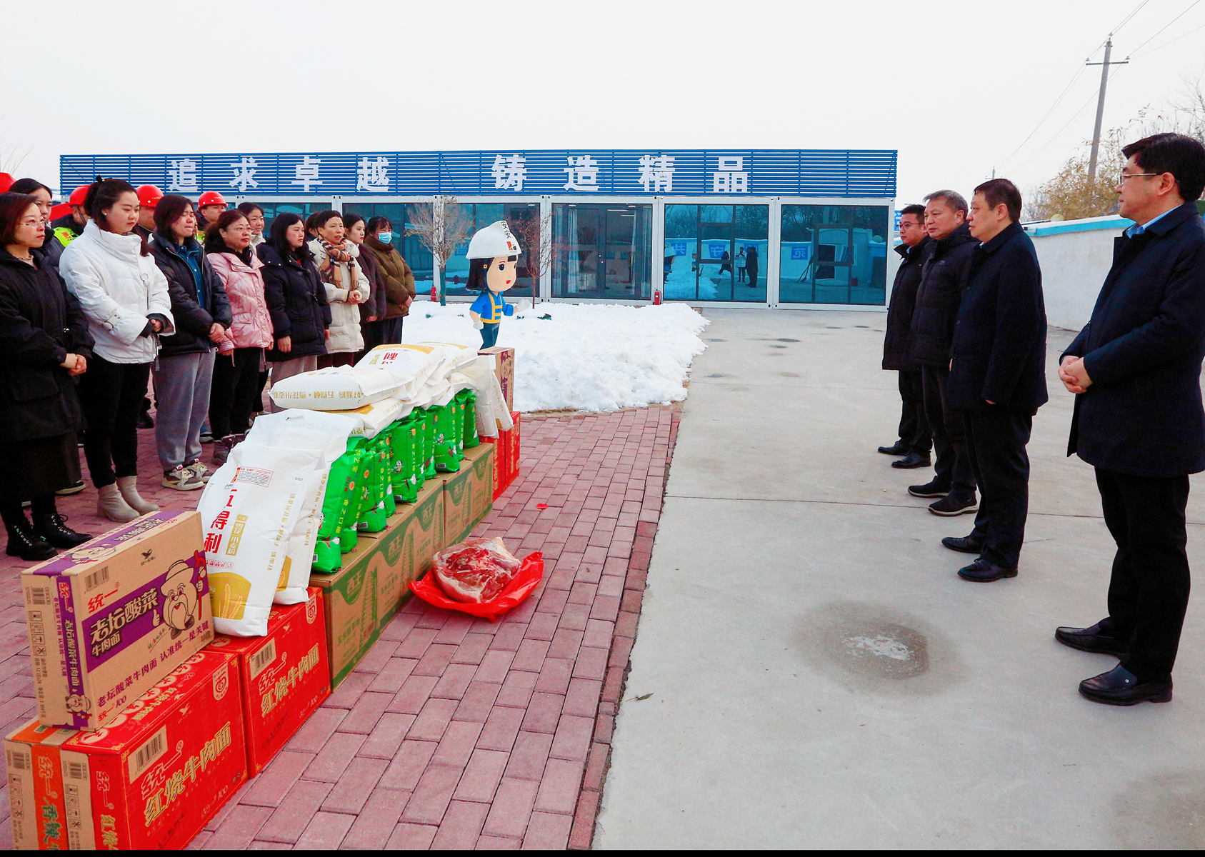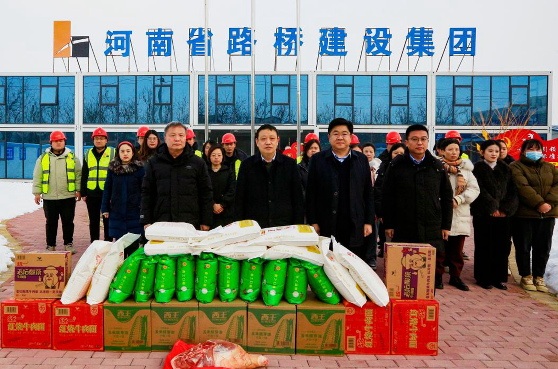 春節(jié)來臨之際,2月6日,河南省路橋建設(shè)集團(tuán)黨委書記、董事長(zhǎng)楊樺親臨路泰公司中原智慧冷鏈物流園項(xiàng)目,看望慰問奮戰(zhàn)在施工一線的職工們,并送上米、面、食用油、豬肉等慰問品。黨委副書記、副總經(jīng)理田濤、副總經(jīng)理梁建華、集團(tuán)首席專家、工程與安全管理中心主任劉金波、群工部經(jīng)理王春玲等參加慰問。